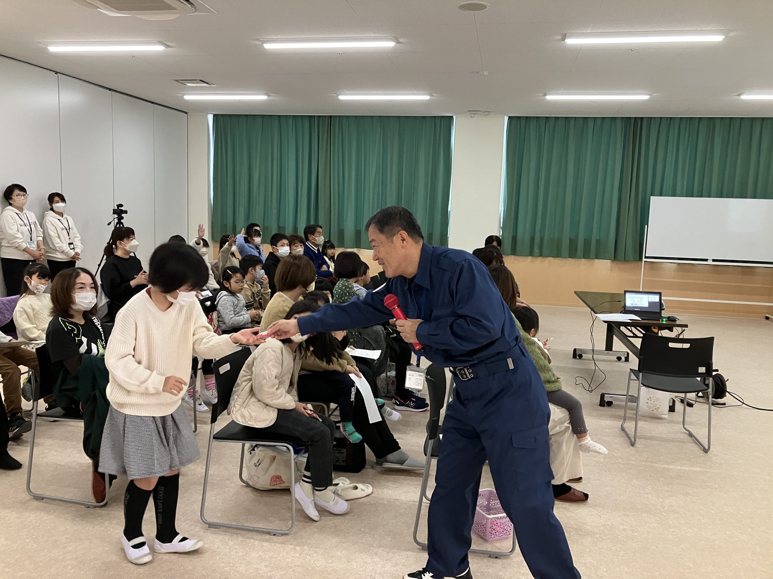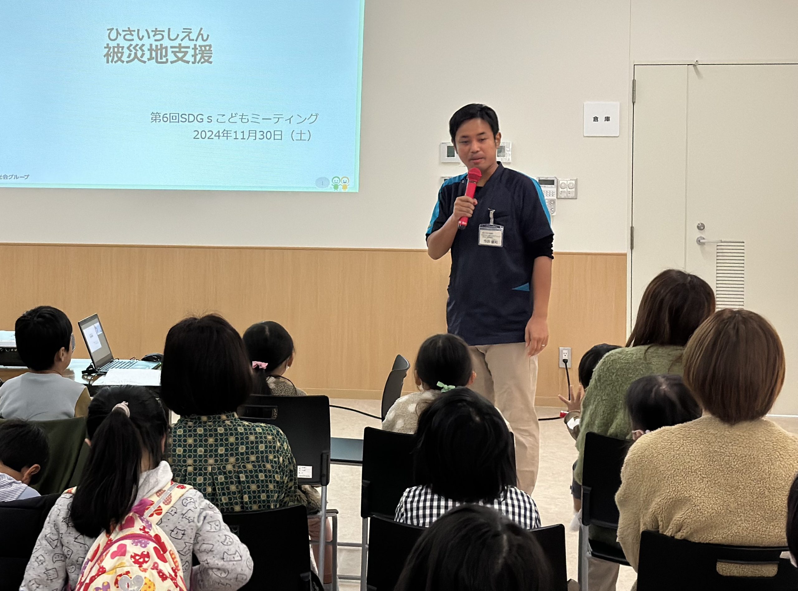 また、能登半島地震の被災地支援に参加した和光会職員が、避難所での生活や被災地の現状について体験談を語りました。現地のリアルな様子に、子どもたちだけでなく保護者の方々も真剣な表情で耳を傾けていました。