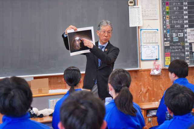 地元の久々野中学校、宮中学校、朝日中学校の3年生に受験等の御守りとして貫通石を贈呈しました。