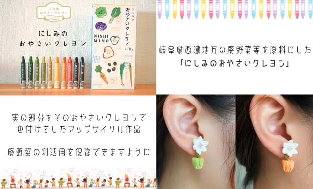 参考:こびとの農園「【プレスリリース】廃棄野菜から生まれた「にしみのおやさいクレヨン」で彩る、環境にも人にもやさしいつまみ細工の耳飾りが誕生!~第1弾はピーマン・パプリカ。岐阜県西濃地方から広がるアップサイクル~」