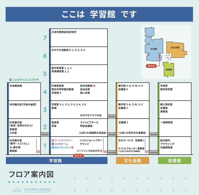 大垣市スイトピアセンターは、複数の建物、沢山の部屋があります。年齢や言葉の壁を越え、どなたにも分かりやすい案内を目指して、色やピクトグラムでの案内に取り組んでいます。