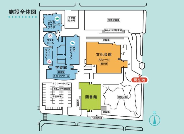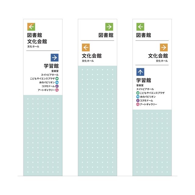 各所のご案内は、統一された色を採用。 子ども達が集まる施設や、プラネタリウム、アートギャラリーなどには、ピクトグラムを設定して、色と形の両面でご案内しています。 |