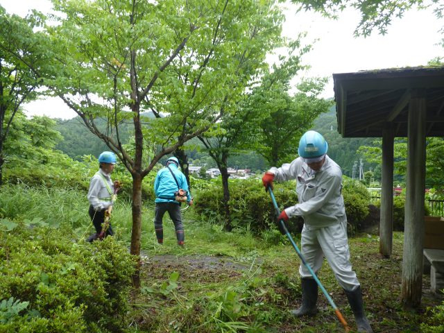 弊社では27年前から継続して参加する会社行事となっており、例年同様の久須母橋付近(高山市久々野地内)の沿道修景作業として公園の草刈りや枝払い作業を実施した。