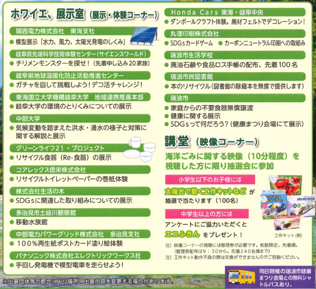 「SDGsについて考えよう〜身近な取組から始めよう〜」をテーマに、環境美化意識・環境保全意識向上のため、企業などによる展示・体験コーナーの他、子供向けのワークショップ(ダンボールクラフト等)を開催。 |